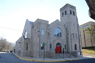 The First Presbyterian Church is a historic church at 213 Whittington Avenue in Hot Springs, Arkansas. It is a large stone building, designed by Charles L. Thompson in Late Gothic Revival style and built in 1907. It has a square tower with pronounced buttressing at the corners set on the right side of its front facade, and a lower tower at the left side, with a gabled entry section at the center. The entrance is set in a broad lancet-arched opening, and is topped in the gable by a three-part stained glass window. The main sanctuary space is set perpendicular to the main facade, with a large stained glass window set in a recessed round-arch panel at the end. An entrance into the tunnels underneath hot springs is also located here.[2]