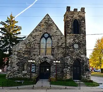 First Presbyterian Church, also known as Rock Church, is a historic Presbyterian church located at 212 E. North Street in Marshall, Saline County, Missouri, United States. It was built between 1871 and 1873, and is a one-story Gothic Revival style yellow sandstone building. It features pointed arch windows and a corner bell tower.[2]: 2