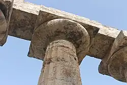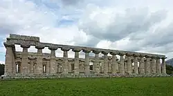The First Temple of Hera (Paestum)—also known as Temple of Hera I and the Basilica—is an archaic Doric order Greek temple in the ruins of the ancient city of Paestum, Italy.[1][2] This Doric temple is considered one of the oldest Greek temples in Italy and is known for its distinctive architectural features.[3][1] It was built around 550–525 BCE, within a century of the city's establishment by Greek colonists from Sybaris, who named the city Poseidonia.[4][2][3]