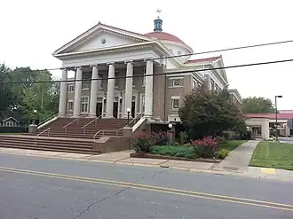 First United Methodist Church is a historic Methodist church at the junction of Prince and Clifton Street in Conway, Arkansas. It is a two-story brick building with Classical Revival style, set on a raised foundation. The building is basically rectangular in shape, but its main roof is cruciform, with gables on all for sides, and a dome at the center. The front has a fully pedimented six-column Classical portico, with an entablature and dentillated pediment with a small round window at its center. The church was designed by George W. Kramer of New York City, and built in 1913 for a Methodist congregation founded in 1871.[2]