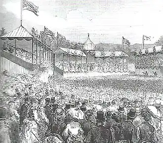 The park was opened on 16 August 1875 by Albert Edward, the then Prince of Wales, and Princess Alexander. The royal couple were the guests of Firth, staying at his mansion Oakbrook in the city. The weekly newspaper The Graphic reported that the royal visitors arrived at Firth Park in a procession of forty carriages from Victoria station with the band of the Hallamshire Volunteer Rifle Corps playing the "Firth Park March". The royal couple were seated in a temporary pavilion designed to look like a Turkish minaret and 15,000 school children were assembled in front to sing the national anthem. At the time of the royal opening much of the park was still unfinished and Firth spent an additional £9,000 before a second ceremony was performed on 22 August 1876 to mark the completion.[1]