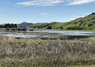 A report on the area's importance as a critical wildlife corridor recommended a riparian restoration project along Fisher Creek to reestablish stands of California sycamores (Platanus racemosa), Fremont cottonwoods (Populus fremontii) and willows (Salix sp.) and a reestablishment of valley oaks (Quercus lobata) throughout the valley.[12] Fisher Creek is a tributary to the largest freshwater wetland in Santa Clara County, Laguna Seca. "In Coyote Valley, Laguna Seca offers a rare opportunity to restore natural wetland functions and a diverse wetland habitat mosaic. Laguna Seca restoration would link to existing buffers and have regional significance as a large, natural, valley floor wetland."[13] These seasonal wetlands provide critical habitat to many species of wildlife year round and are important to migratory birds. Laguna Seca's vernal pools provide habitat for endangered species such as the California tiger salamander (Ambystoma californiense) and the California red-legged frog (Rana draytonii).[12]