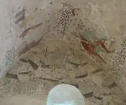 On the west wall the subject is the " Resurrection " and the "Last Judgement". Over the north door is a picture of Herodes Roy—King Herod ; close by is another: " The Scourging of Christ ". On the North ceiling over the door is a picture of our Lord " Riding upon an Ass " ; close by is a picture of a Roman soldier. On the south ceiling in the little Chancel, portions of Adam and Eve and the children are to be seen.