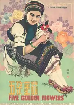 Five Golden Flowers (Chinese: 五朶金花; pinyin: Wǔ duo jīnhuā) is a 1959 Chinese romantic musical film directed by Wang Jiayi and produced by Changchun Film Studio. The screenplay was written by Zhao Jikang and Wang Gongpu. Set in the Dali City in Yunnan Province, the film is about a Bai ethnic youth, Ah Peng, searching for his beloved ethnic girl Jin Hua (Golden Flower). Made during the Great Leap Forward, the film celebrates socialist construction and agricultural collectivization. The theme song of the film "By the Butterfly Spring," composed by musician Lei Zhenbang, was one of the most well-known folk songs in China. The film was produced and released in 1959. It received exuberant responses from audiences and was exported to 46 countries after its debut. During the Cultural Revolution, it was banned and attacked by Jiang Qing for promoting romanticism. In 1978, the film was re-released. At the Second Asian-African Film Festival in Cairo in 1960, the film won the best director and best actress awards. In the 2000 Changchun Film Festival, Five Golden Flowers won first place in the "Top 10 Chinese Films of the Century" selection.