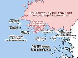 The Five West Sea Islands (also called the Five Islands of the West Sea or the Northwest Islands) (Korean: 서해오도; Hanja: 西海五島) refers to the five islands in the West Sea (Yellow Sea) administered by Incheon, South Korea. They are Yeonpyeongdo, Baengnyeongdo, Daecheongdo, Socheongdo and Soyeonpyeongdo. Their positions are much closer to North Korea as these islands are originally part of Hwanghae Province and their sovereignties are claimed by North Korea,[1] but they are controlled by South Korea since the United Nations forces established the Northern Limit Line (NLL) north of the islands in 1953 following the Korean War.[2]