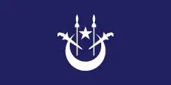 State and war ensign | A blue field with a white crescent and star and two white kris and spears in a red canton. |