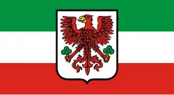 The civil flag of the city of Gorzów Wielkopolski is divided into three equally-sized horizontal stripes. They are, from top to bottom, green, white, and red. The colours were based on those of the city coat of arms. The proportions of the flag have the aspect ratio of its height to its wight equal 6:11. The state flag depicts the coat of arms of the city, placed in the centre of the civil flag. The coat of arms consists of the white Iberian style escutcheon (shield) with square top and rounded base. In its centre is placed a red eagle with its head facing left, and spread wings, and a red tongue put out. It has yellow (golden) beak, and clows at its legs. The eagle holds a green clover in each of its legs.[1][2]
