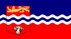In absence of a registered flag, the banner of arms of Herefordshire Council is sometimes used, with it having been flown alongside the Union Flag above the Department for Communities and Local Government.[1][2] It features a river running through a red background with a lion passant guardant (sometimes called a "leopard") above and the head of a bull below.[1]