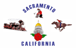 The first and former flag of Sacramento, California, is a white background with a dome of the California State Capitol accompanied by a white rose surrounded by a train, a miner, and a person on a horse. Those elements are surrounded by the city's and state's name in blue. It was adopted on January 23, 1964, designed by Max Depew and E.A. Combatablade, with the sketch of the flag made by Goodwin & Cole, and has proportions of 7:11.