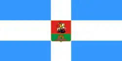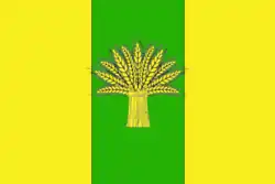 The flag of Stavropol Krai of Russia is a Nordic Cross charged with the krai's coat of arms in its centre. The cross itself is white set on a golden background. In one version, the coat of arms is depicted entirely in gold, in correspondence to the flag's background. In another version, it is in its full array of colours.