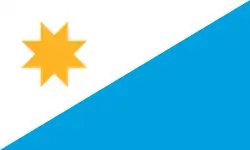 The city flag of Toledo, Ohio consists of 3 horizontal bands, blue, white, and white, with smaller light blue bands separating them. It has a sunburst in the top left corner and a simplified version of Fort Industry in the center. The current flag was adopted in 2025 and was designed by artist Mark Yappueying.[1]