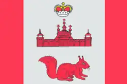 The flag of Vologda Oblast, a federal subject of Russia, was adopted 26 November 1997.[1] The flag is a field of white, with a red vertical band on the fly. A charge of the Vologdan seal is in the upper hoist corner. The seal is red, with a hand emerging from a cloud, holding an orb and a sword. A crown floats over the hand. The ratio of the flag is 2:3.