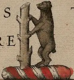 The design features the traditional bear and ragged staff used in the county since the Middle Ages as a symbol of the Earls of Warwick.[1] The first recorded use of the two symbols was by the Beauchamp family, who became the Earls of Warwick in 1268, as a seal. They were initially used separately, and the earliest known appearance of them together was on a bed of black cloth embroidered with a gold bear and silver staff owned by Thomas de Beauchamp, 12th Earl of Warwick (1338โ1401).[2] The bear and ragged staff appear in the same arrangement as the flag in John Speed's 1611 map of the county.[3]