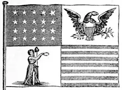 1817 proposed flag (not adopted)During the committee discussions which eventually led to the Flag Act of 1818, an additional flag was proposed which was to indicate the president's presence at places he visited. The design divided the flag into four quarters (like the British royal standard): the upper left was the white stars on a blue background (same as the national flag); the lower left had a Goddess of Liberty on a white background; the upper right had an eagle emblem on a white background, and the lower right had the thirteen red and white stripes. This flag was not seriously considered and was not adopted.[3][4][5] Samuel Chester Reid, who proposed this design, made a drawing of it years later which showed the eagle and Liberty in switched positions, and had the stars arranged in a larger star.[6]