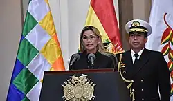 - ^ "Colocan la bandera de la Flor del Patujú junto a la wiphala y la tricolor en Palacio Quemado" (in Spanish). El Deber. November 14, 2019.