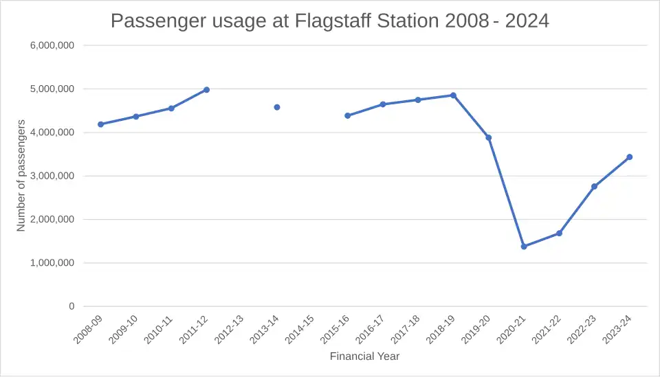 As of 2023-24, Flagstaff is the seventh-busiest station on Melbourne's metropolitan network, with 3.435 million passengers.[11][12]