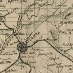 During the Civil War, General George Steone Jr, sent Kenner Garrid's Division to the Flat Rock area in order to protect the Union rear during the Atlanta Campaign. Garrard's Raid to South River, Georgia, included the 7th Penn. Cavalry heading to Flat Rock Bridge, Georgia, July 28, 1864.[7] Union foraging parties also searched the area for supplies to bring back to the Union army while they occupied Atlanta. There was a skirmish between the Union and Confederate armies, on November 16, 1864, after Sherman's armies successfully defeated the Southern Confederate armies in the Battle of Atlanta, the March to the Sea, which included about 26,000 Union soldiers heading East traveled through the Flat Rock area where they crossed Snow Finger Creek and continued through Lithonia and Conyers.[8] Some Union soldiers described what they witnessed as they traveled the countryside in Sherman's March to the Sea which included the following: the area was peppered with freed slaves, venturing out of their cabins and plantations to meet the singing soldiers to celebrate what seemed to former slaves as the day of the Jubilee. Some freed souls claimed that Sherman was the Great Deliver, as one man claimed he had been waiting for this "Angel of the Lord since he was knee high", as he had come and freed them all. So many freed peoples overwhelmed the soldiers as they recalled seeing every type of person imaginable from old to young, mulatto to black, males and females. The soldiers wrote about seeing toothless aunties, old souls with gray heads, woman carrying their babies in their arms wearing old torn clothing and all running to thank the soldiers and embrace the flags which were flown by the many regiments and companies. The newly freed slaves, which seemed like thousands to the Union soldiers, ran after the troops to join the Army of the Lord to freedom. At every crossroad and plantation more freed people joined the crowds signing with the bands playing their instruments.[8][9]