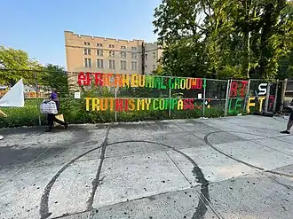 ![]() A sign on a chainlink fence designating the Flatbush African Burial Ground site, 2021 | |