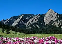 The Flatirons near Boulder, Colorado, is both an example of these landforms and the source of their name. Other well-developed flatirons are found in the eastern Uinta Mountains in northwestern Colorado,[6] the Waterpocket Fold in Capitol Reef National Park, the Superstition Mountains near Phoenix, Arizona, and on the flanks of the Marathon Uplift in west Texas.[1]