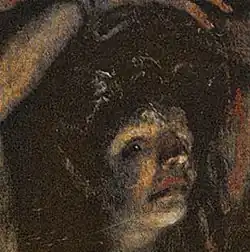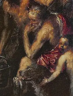 Beyond the purely technical means, many critics have tried to articulate evocations of Titian's pictorial language in this and other very late paintings.[65] According to Sydney Freedberg, "the surfaces of bodies make a silvered incanescence and the atmosphere, almost unbreathably dense, is like dulled fire. ...There is a wry comedy within the cruelty, ugliness and strangeness within the magisterial beauty, and terror accompanies the sense of the sublime."[66] For John Steer "it is not individual colours that tell, but an all-over emanation of broken touches, evoking a greenish-gold, that is splattered, appropriately to the theme, with reds like splotches of blood. Vision and expression are here so much one that they cannot, even for the purposes of discussion, be separated. .... Titian's intense struggle to grasp in paint, through tone and colour, the physical realities of the scene is a fundamental part of their meaning."[67]