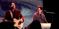 The band continued to tour as a duo, with Linnell playing accordion and Flansburgh on guitars, or occasionally playing a marching band bass drum. Large posters of postage stamps adorned the stage as props; the minimal arrangement was received as a boldly simple choice. Sets included a combination of old and new material.[30] As in the past, the band was backed by a tape deck playing drum tracks or a metronome in lieu of a full rhythm section.[31]
