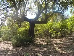 Characteristic plants are Pinus halepensis, Erica arborea, Arbutus unedo, Pistacia lentiscus, Myrtus communis, Clematis cirrhosa, Asparagus acutifolius, Phlomis viscosa, Scilla autumnalis and Scilla peruviana, Narcissus tazetta, Iris palaestina, Colchicum stevenii, Arisarum vulgare, Quercus coccifera, Quercus ilex, Ceratonia siliqua, Pistacia atlantica, Pistacia terebinthus, Crataegus azarolus, Amygdalus communis, Rhamnus alaternus Nerprun alaterne, Cistus spp., especially Cistus monspeliensis, Cistus laurifolius and Cistus salviifolius, Juniperinus phoenicea, Phlomis spp. (Phlomis lychnitis), Helichrysum italicum, Salvia spp.,[2] Satureia spp.,[3] Poterium spp., Arabis spp., Reseda spp., Aristolochia pallida, A. boetica, A. longa paucinervis, A. fontanesi, A. rotunda, A. pistolochia fr:Aristoloche pistoloche, Lavandula stoechas, Jasminium fruticans, and Brassica spp.