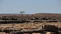 In steppe areas where the scrub vegetation is hardly developed desert grasses of a multiplicity of species are the climax vegetation. Ephemerals are common in the north, halophytes in the sandy areas. Succulent plants are uncommon. The sandy desert has virtually no vegetation. With rain vegetation increases in wadis (oueds - vallies, gullies, or streambeds that remain dry except during the rainy season),depressions and wherever runoff water augments rainfall. The soils of the Sahara are formed of rock debris and desert detritus and are very weakly developed. The characteristic species of these true desert areas which decrease as desert scrub becomes reg and then sandy desert are:- Faidherbia albida, A. raddiana, A. seyal, A. tortilis, Achillea santolina, Alyssum macrocalyx, Anabasis aretoides, A. articulata, Androcymbium punctataum, Aristoides coerulescens, Aristida pungens, Artemisia herba-alba, A. monosperma, Astragulus tribuloides, Atriplex halimus, Balanites aegyptiaca, Caligonum comosum, Caltropis procera, Cenchrus ciliaris, Citrullus colocynthus, Danthonia forskalii, Ephedra alata, Euphorbia guyoniana, Deverra scoparia [1] Archived 2016-04-03 at the Wayback Machine, D. chloranthus, Linaria aegyptica, Annarrhinum fruticosum [2], Haloxylon guyonianum, Maerua crassifolia, Nerium oleander, Olea europaea, Panicum turgidum, Phoenix dactylifera, Populus euphratica, Prosopis stephaniana, Rhus oxyacanthae, Roetboellia hirsuta, Salsola foetida, S.inermis, Salvadora persica, Stipa tortilis, Suaeda fruticosa, S.vermiculata, Tamarix articulata, Zilla spinosa, Zygophyllum coccineum, Z. decumbens, Z. dumosum s and Capparis spinosa. In the depressions and inter-dunal areas, bushes Retama raetam, Ziziphus lotus, Genista saharae,Calligonum comosum, Acacia raddiana, Acacia seyal, Pistacia atlantica, Tamarix aphylla, Calligonum azel and Calligonum arich. In the depressions of the dayas and uidians, there are endemic species such as Panicum turgidum, Pituranthos sp., Neurada procumbens, Anastatica hyrochuntina and Astragalus gumbo. The hammadas often have endemics such as Pituranthos chloranthus, Helianthemum lippii, Gymnocarpos decander, Helianthemum kahiricum, Anabasis aretioides, Haloxylon scoparium and Arthrophytum schmittianum.
