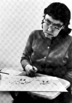 ![]() Florence Nupok Malewotkuk working on a brush painting in 1965 | |
