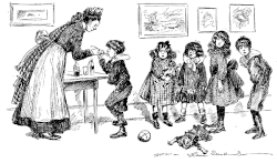 Her keen sense of humor crops out in every group, and the turn of a line gives a comical effect. The peculiar gift that Mrs. Shinn is endowed with is that she can draw the most pitiful little figures and yet infuse into the picture a happy, healthy atmosphere that impresses us with the worth and joy of living. Her characters are never caricatures; they are appealing and provoke the laughter that bears no malice.[11]
