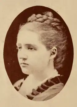 There is little to record of Brittingham's childhood.[6] In the fall of 1871, when nearly fourteen years of age, Brittingham was entered as a pupil in the Eclectic Institute, Baltimore, Maryland, where she remained for three years under the care and tuition of Letitia Tyler Semple, the principal.[5] Here she remained three years, when, having finished the course with high honors, she returned to her valley home.[6]