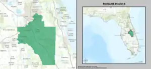 Florida's 9th congressional district is a congressional district in the U.S. state of Florida. It stretches from eastern Orlando south-southeast to Yeehaw Junction. It also includes the cities of Kissimmee and St. Cloud.