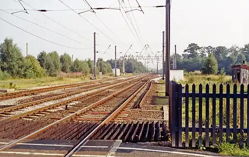 Trains pass at speed on the electrified West Coast Main Line. The station platforms and all other buildings have been demolished, the pedestrian overbridge has also been removed, however the level crossing is still present.