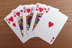 A flush is a hand of playing cards where all cards are of the same suit.[1] There are different types of flush, including straight, where the flush is formed from a run of cards in unbroken sequence of ranks. Flushes are one of the types of scoring hand in poker.
