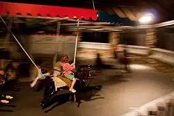 The carousel is believed to have been built around 1876 by the Charles W. F. Dare Company of New York. This is about the same time attributed to the construction of the Flying Horses Carousel in Oak Bluffs, Massachusetts, although both dates are based on inferences and lack certainty. It consists of twenty horses in two sizes which are suspended by chains from sweeps radiating out from the center of the carousel under its canopy. The bodies of the horses are believed to have been carved from single blocks of wood, with the legs carved separately and attached. The horses still have their original agate eyes; other trappings have been replaced, including manes and reins. The chains holding the horses are attached to the rump and to an iron bar added to the pommel, apparently a modification. When the carousel rotates, centrifugal force drives the horses outward, giving rise to the name "flying horses." The horses in the Oak Bluffs carousel are fixed to columns between spreader panels above and a platform below.[3]
