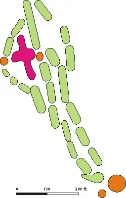 ![]() Simple outline of the mound group, linears/compounds in green, conicals in orange, cruciform in red. | |
