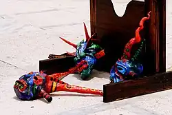 The Vejigante comes in two variations, those of Loíza are depicted as colorful horned monsters with crooked teeth and they represent a demonization of the Moors by the ancestors of the people involved in the Reconquista as part of the traditional Santiago Feast. The other variant, whose masks depict more reptilian-looking albeit equally colorful monsters with forked tongues, are a personification of mischief and their role is to play pranks on the populace during the Ponce Festival. Both variants wear festive costumes that resemble wings.
