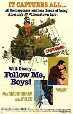 Follow Me, Boys! is a 1966 American comedy-drama film produced by Walt Disney Productions. It is an adaptation of the 1954 novel God and My Country by MacKinlay Kantor and was the final film released by Walt Disney Productions in Walt Disney's lifetime, with Disney dying exactly two weeks after the film's premiere. The film stars Fred MacMurray, Vera Miles, Lillian Gish, Charles Ruggles and Kurt Russell, and is co-produced by Walt Disney and Winston Hibler, directed by Norman Tokar and written by Louis Pelletier. It is one of the few films featuring the Boy Scouts of America and is Disney's paean to the Boy Scouts. The title song "Follow Me, Boys!" was written by studio favorites Robert and Richard Sherman. After the film's production, the Boy Scouts of America considered using the song as their anthem, but efforts toward the end were dropped. The Boys' Life magazine included a teaser article of the film.[2] Follow Me, Boys! was the first of ten Disney films in which Russell appeared over the next ten years. A DVD version was released on February 3, 2004 by Walt Disney Home Entertainment, although it is in 4:3 pan and scan format, not the original 1.66:1 wide screen aspect ratio.