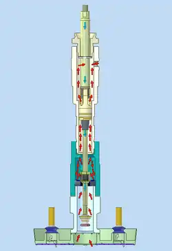 A scooping piston pump used with follower plate. The red arrows show the flow of the material, the blue ones the movement of the piston and the white arrows show, how the air is sucked out underneath the disposable follower plate
