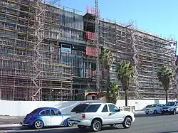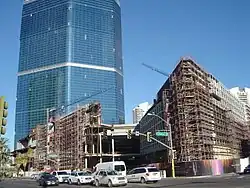 The bank group was led by Bank of America,[38] which began negotiating with Fontainebleau shortly after the lawsuit was filed.[39] Through a separate lending group,[38] the project had $130 million to continue construction while the lawsuit proceeded.[38] However, the second group partially pulled its financing in late April 2009, after the first group rescinded its loan on the project. Work was reduced to skeleton crews, and construction proceeded at a slower pace.[38][40] In May 2009, Fontainebleau filed an amendment to its lawsuit, stating that Deutsche Bank, part of the main banking group, had a conflict of interest. The bank had an ownership stake in the upcoming Cosmopolitan resort, also under construction on the Las Vegas Strip. Deutsche Bank was accused of "seeking to destroy the Fontainebleau in order to minimize competition" for the Cosmopolitan. The bank was to provide $80 million to the Fontainebleau.[41][42] The allegations against Deutsche Bank were eventually dropped.[43]