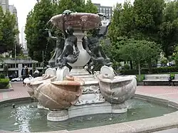 A replica of the fountain, made in Rome in the early 1900s, was bought by William H. and Ethel Crocker for their estate at Hillsborough, California. It was given to the city of San Francisco by their four children and installed in Huntington Park, Nob Hill, in 1954. It stands rather lower in the water than the Roman original.[1]
