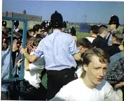 Whilst all this was happening the HBC had arrived in Oldham and ended up fighting with the FYC mob that proved to be too strong for the Hibs youngsters. The Oldham boys thought that was it for the day until the remainder of the CCS turned up belatedly due to their earlier exertions. When it was discovered what had happened prior to their arrival the Hibs mob anger was tangible enough for the police to attempt to contain them within the away terracing. This section of the ground was enclosed by a series of metal pens and the police tried to lock the gates on them but were met by resistance from the Hibs boys throughout the game. Eventually the police abandoned this plan and then relied upon securing the huge wooden gates at the perimeter of the stadium. Even this didn't stop the rampant CCS who after the final whistle managed to crash open this last obstacle between them and the FYC. The raging Hibs mob quickly overcame the police lines outside the ground and steamed into Oldham's mob.[8]