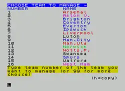 It was later converted to Sinclair's ZX80 and ZX81,[5] and Toms created the software label Addictive Games to launch the game in 1982. It was then ported to the ZX Spectrum[6] with added animated graphics showing match highlights. The game was a huge success and was ported to a wide range of systems between 1984 and 1987.[7][8] While the Amiga, Amstrad CPC, Atari ST, BBC Micro, Commodore 64, MSX, and DOS versions, kept, or improved all features such as the match highlights graphics, all others (including the Acorn Electron, Atari 8-bit computers,[9] Commodore 16, and Plus/4) were, like the original, text only.