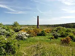 On the western edge of the site are located the remains of a colliery which was in use from at least the late 17th century to the outbreak of World War I.[14] The colliery supplied local businesses, such as a brick and tileworks at Flodden and Ford Forge.[15] A small collection of houses surrounded the colliery and there was even a railway proposed in 1852 which was however never built.[16] Despite not falling out of use until reasonably recently there is very little evidence of it to be found except for engine house walls, the bases of some of the miners' cottages, and an engine house chimney, Grade II listed in 1988 and described as "Mid C19. Snecked stone and brick in English Garden Wall Bond. Tall square stone base with a round brick arch on 2 sides. Tall round brick chimney with roll-moulded ashlar base and ashlar cornice."[17]