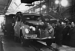 The tooling for the pressed-steel bodywork had during the war remained in Berlin with the US owned body builders Ambi Budd, and after lengthy negotiations with the Soviet military authorities was eventually released. Due to lack of available space at Ford's Cologne plant, production of the first 1948 cars was subcontracted to Volkswagen in Wolfsburg and Karmann in Osnabrück, but in November 1948 the entire production process was taken in house by Ford. 182 Taunus sedans and 144 light deliveries were built during 1948.[4] At this stage, as in 1942, only a single body style was available. The 1948 Ford Taunus was a small fast-back saloon with two rear hinged doors, and available only in Night Shadow Grey, presumably reflecting paint availability in the aftermath of war.