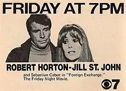 Foreign Exchange is a 1970 American action thriller drama spy television film originally aired on ABC and directed by Roy Ward Baker.[1][2] Its teleplay, written by Jimmy Sangster, was based on his own 1968 novel of the same name.[3] The film starred Robert Horton, Jill St. John, and Sebastian Cabot.[4] It is a sequel to the television film The Spy Killer, which was released the previous year.[5]