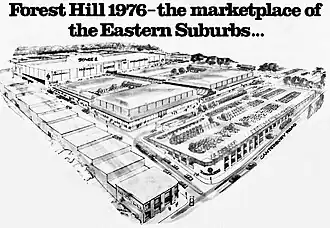 In April 1974, the centre's owners announced plans to extend the Forest Hill Centre by 24,0000m2.[75] A finalised redevelopment scheme was released in June 1975, which was to cost $10m (roughly equivalent to $115m in 2025). A free-standing, split-level indoor shopping centre was to be built on the original rear car park and would have air conditioning, escalators, additional shops, a large fresh food market, community spaces and a new radio booth. The project was advertised as the "largest shopping/market complex in the Eastern suburbs" and was projected to serve a catchment area of 370,000 customers.[76] The redevelopment officially opened on 20 July 1976.[77]