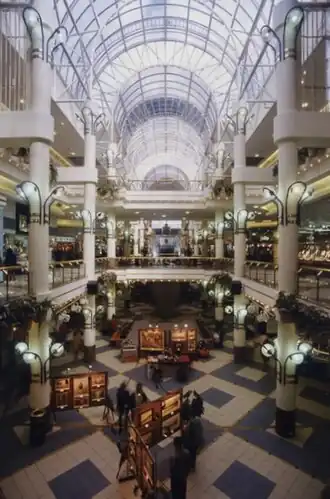 Furthermore, the outdoor centre's facilities were found lacking in several key areas. It provided insufficient amenities for shoppers, including inadequate weather protection in numerous locations, a lack of air conditioning in various shops and common areas, and limited space for display and promotional activities.[79][80] A proposed $100 million redevelopment would see replacement of the original outdoor centre with a multi-level, indoor mall with 210 tenancies, a 450-seat gourmet food court with an indoor charity fountain and glass elevator, a fresh food market, and parking for about 3000 cars.[81] Architects Buchan, Laird and Bawden, who were chosen to design the redevelopment, took inspiration from the St. Louis Galleria in Missouri.[82]