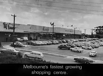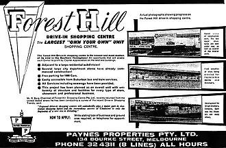 The centre was originally to be named Stonestown after a prominent galleria developer Raymond Borg had visited while surveying malls in San Francisco.[4] Due to the proximity of the two proposed centres, Myer dropped plans for their East Burwood site and instead focused on establishing a centre for Melbourne's south-eastern suburbs. This later eventuated as the Chadstone Shopping Centre, opened in October 1960.[5] Finance for the project at Forest Hill was mainly provided by the Reid Murray group, which held a controlling interest in the development through their subsidiary Paynes Properties. Reid-Murray also owned the Paynes Bon Marche department store chain, which was set to open a large anchor store within the centre.[6]