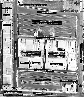 A survey projected the proposed centre would employ 1000 people and serve an 8-kilometre catchment area of 220,000 people per week.[10] It was to be built alongside a 200-lot housing estate called Forest Hill Heights.[11][12][13] Contracter FJ Kerr & Bros established its roads including Barter Crescent, Paul Road (named after developer Paul Fayman) and a 1.3-kilometre extension of Mahoneys Road, connecting Burwood and Canterbury Roads.[14][15]