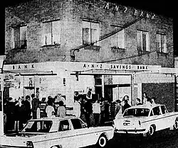 20 July 1969 - A small fire broke out beneath the rear fire stairway of the Forest Hills Theatre, causing the venue to fill with smoke. It began in a pile of empty cardboard cartons and waste paper from nearby shops but was swiftly extinguished. Luckily the incident occurred outside of opening hours, as the rear stairway and exits would not have been usable to evacuating attendees. Provisions were put in place to prevent a reoccurrence.[110]Outside ANZ Bank after hold-up, 197115 June 1971 - Masked bandits and a bank teller fought a battle during a robbery at the ANZ bank on Mahoneys Road, which was Victoria's biggest bank hold-up at the time. The teller fired twice to stop them as they shot their way in with a sawed-off shotgun. The robbers blasted the teller's counter and then forced him to drop his revolver. Then they forced the teller and the bank manager against the wall. The bandits, wearing hessian masks, scooped up $84,700 in notes from a table near the main vault at the back of the bank. A third man who stood outside armed with a pistol fired two shots through a side window as the other two robbers grabbed the money. At least seven shots were fired in the two-minute battle, but nobody was hurt. The bank's security camera was not activated during the hold-up. They ran from the bank, firing as they left, and sped off in a stolen Holden sedan. Five employees, including two young women, were in the bank when the thieves crashed in at about 6:15 pm after smashing the front glass door with a fire hydrant cover.[111] Police subsequently commissioned a special squad to tackle armed hold-ups.[112][113]
